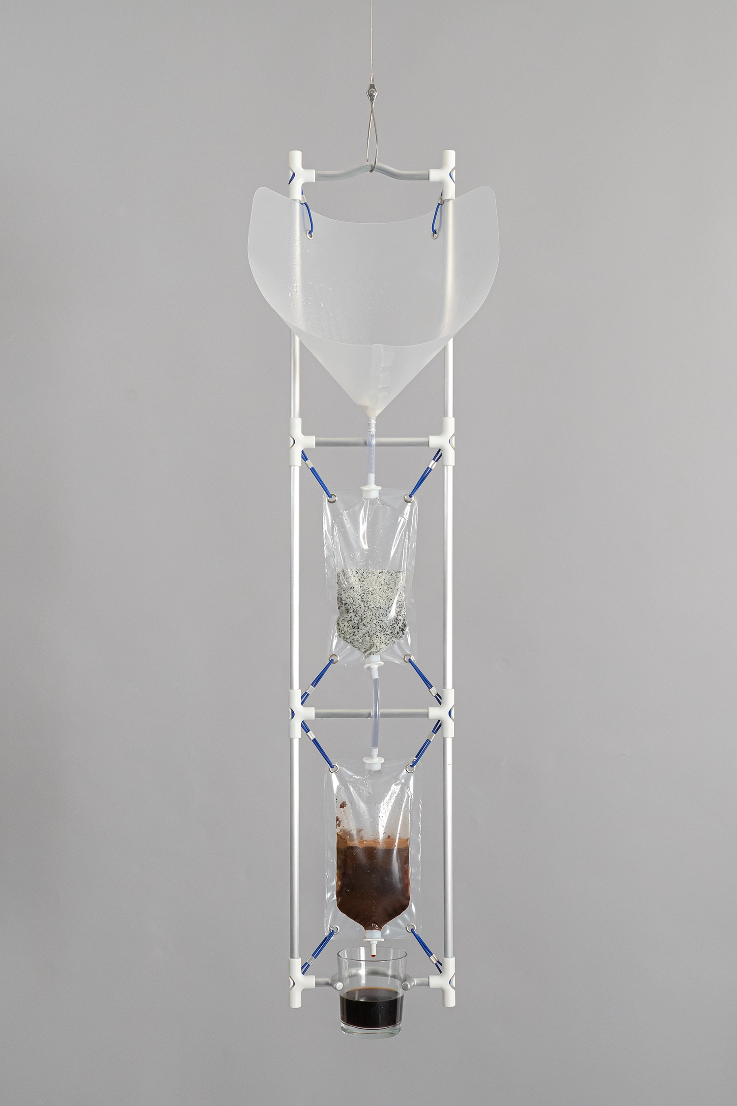 Harvest / Coffee is a drip coffee maker that uses rain water to make one cup of slow drip coffee. The product is made of an aluminum frame that incorporates a three - stage coffee maker consisting of a water collection funnel, a rainwater filter and a pack of ground coffee. The product can be hung outside the kitchen window or balcony to collect rainwater overnight resulting in one slowly dripped cup of coffee.