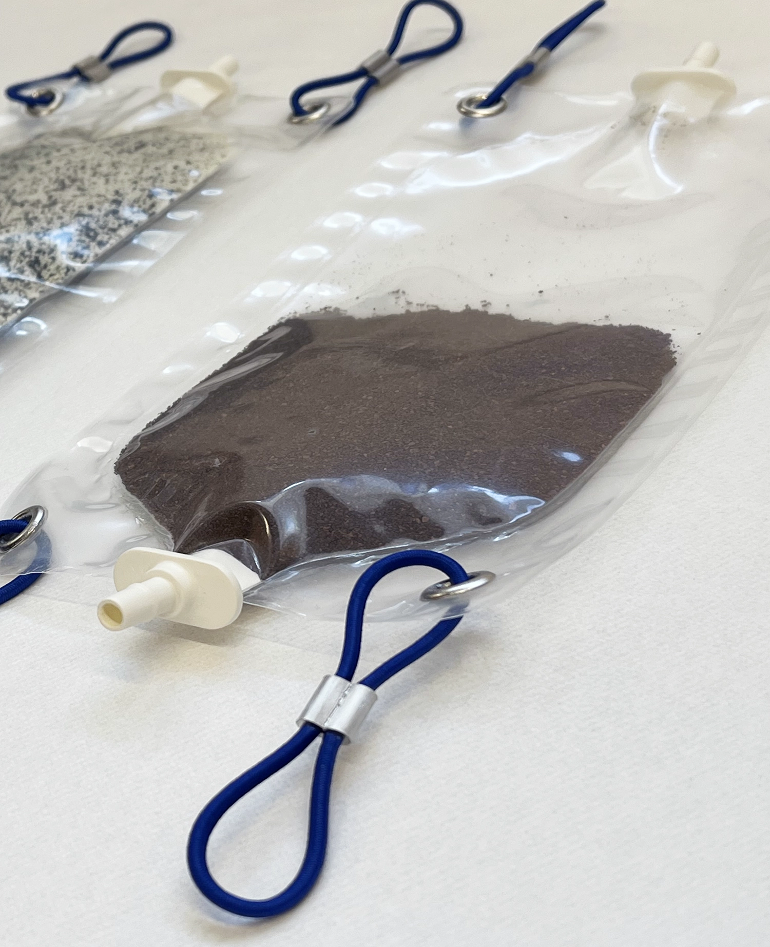 Rubber cords allow for quick and easy suspension of rain funnels and packaging bags on aluminum tube connectors.