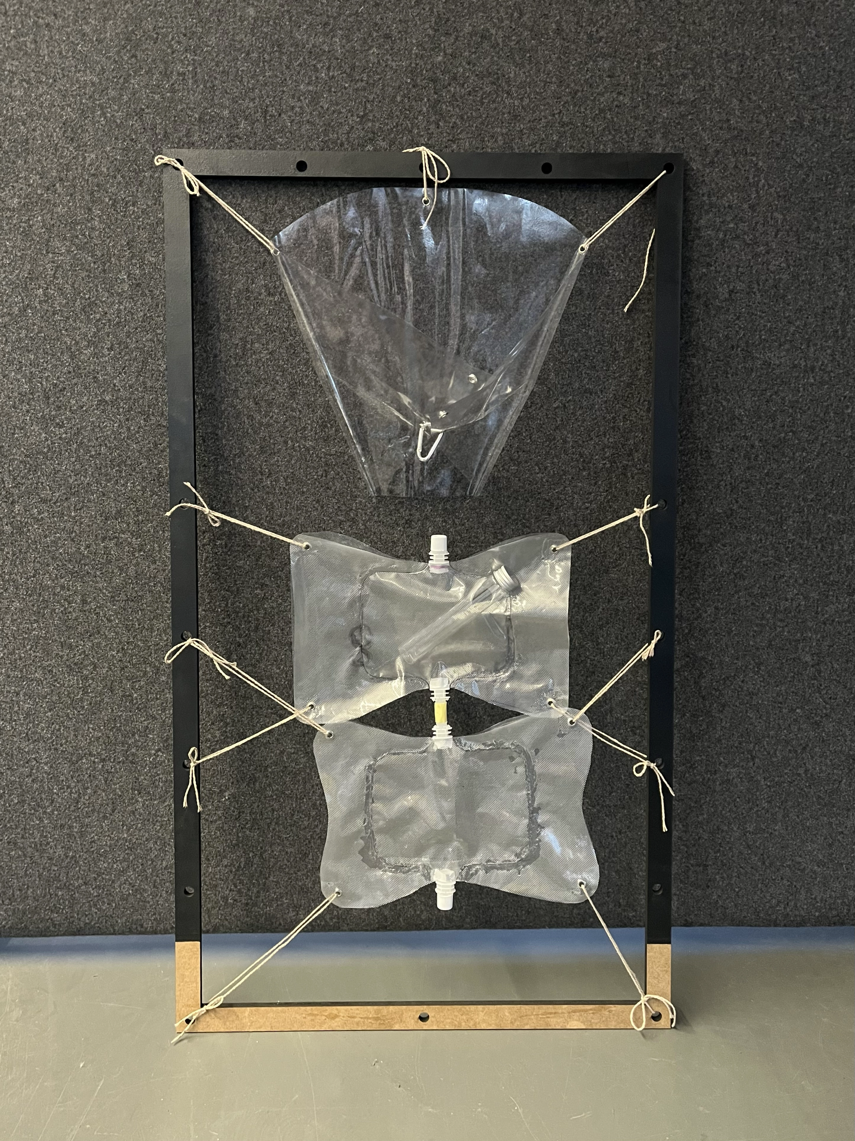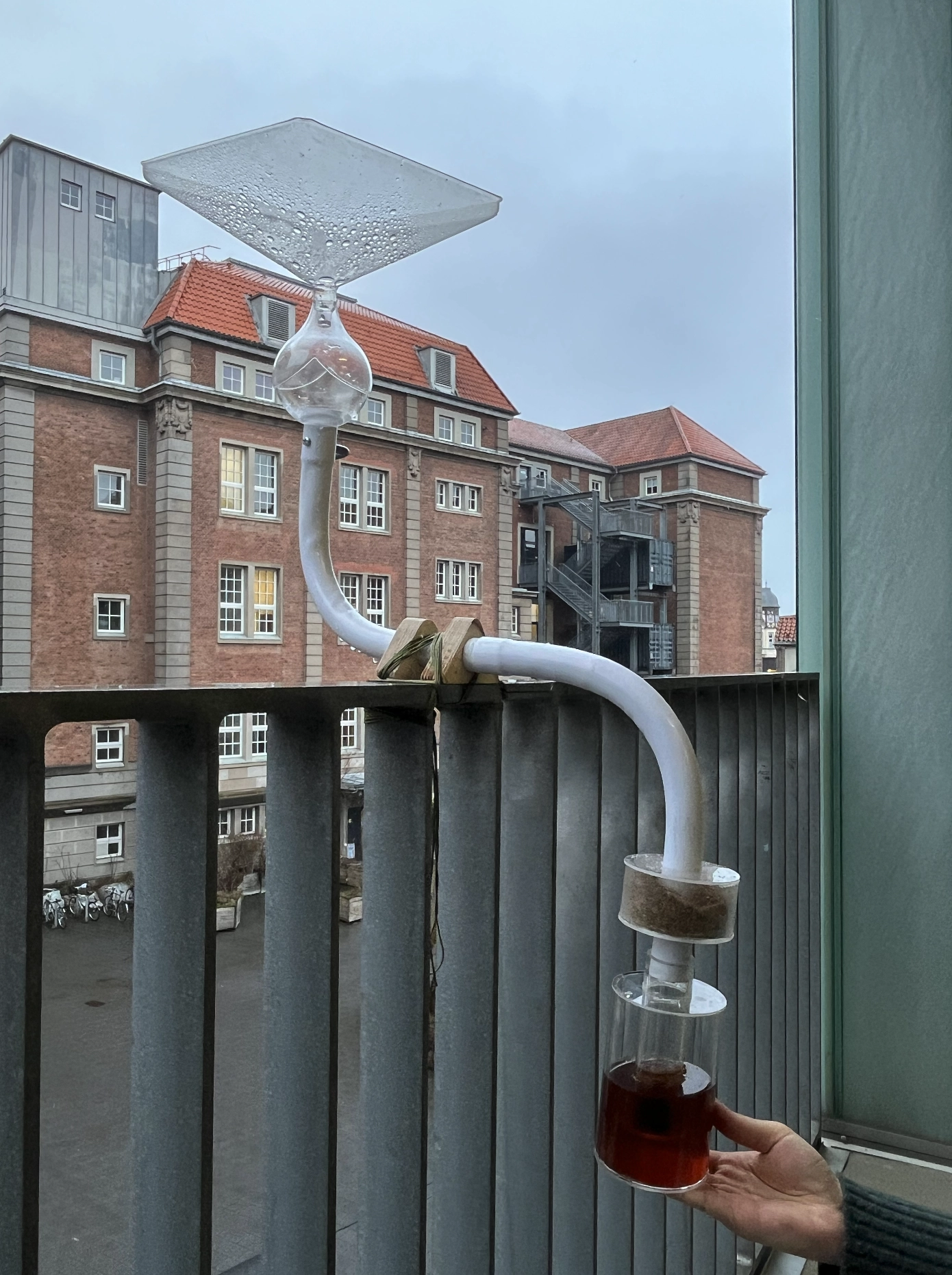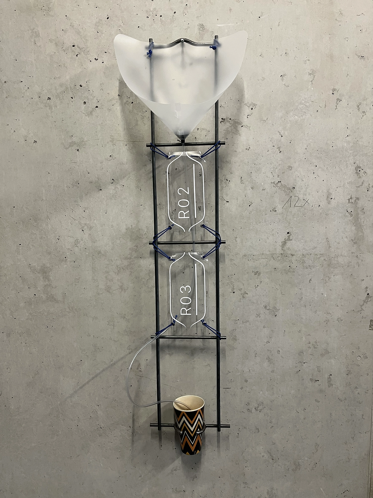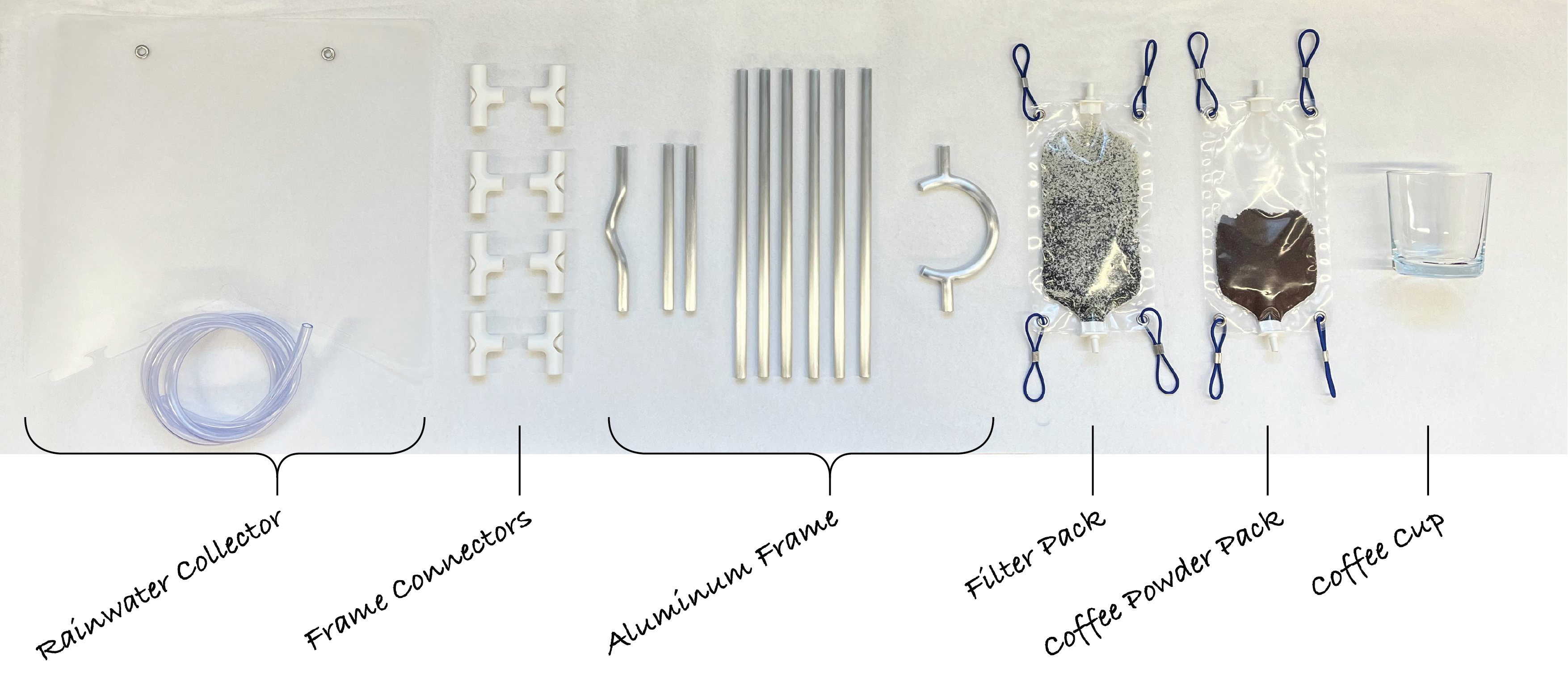 We decided to integrate these functions into a frame structure that can be hung outdoors to collect rainwater. Each functional component can be attached or detached from the frame, and at the bottom, we added a designated space to place a coffee cup.